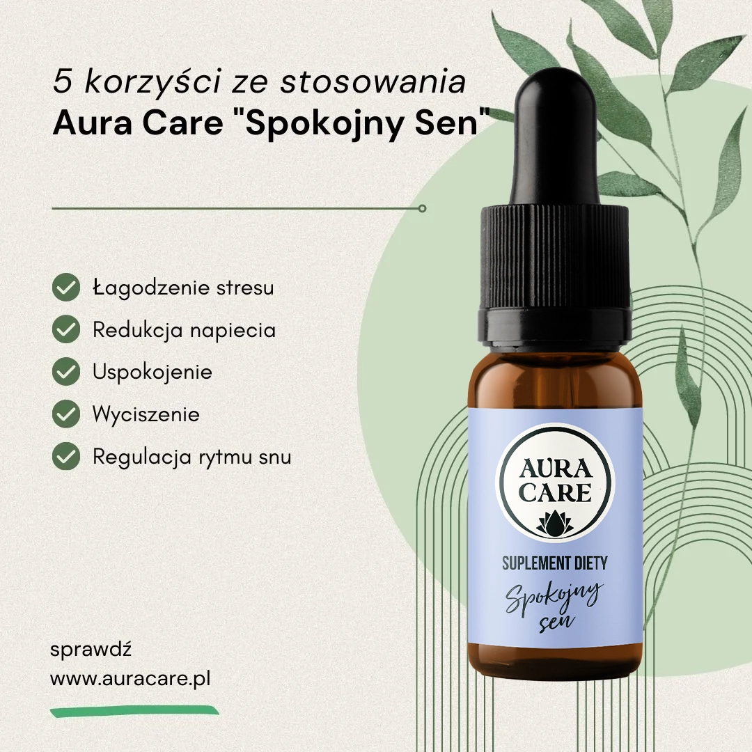 Aura Care „Spokojny Sen” – to Twoje naturalne wsparcie dla zdrowego, spokojnego snu. Dzięki składnikom o naturalnym pochodzeniu, adaptogeny na sen zawarte w olejku łagodzą stres, redukują napięcie, wpływają na relaksację i zapewniają regulację rytmu snu. Przyjmij „Spokojny Sen” na noc, ciesz się spokojnym i głębokim snem. Obudź się wypoczętym i gotowym na nowy dzień. Zapewnij sobie zasłużony odpoczynek i spokój podczas snu już dziś!